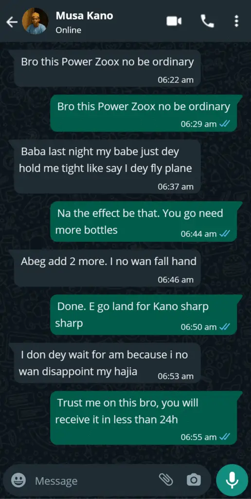 Simple: Power Zoox work has already helped over 1,000 Nigerian men achieve happier, healthier, and more confident bedroom lives. We know what it can do for you too.